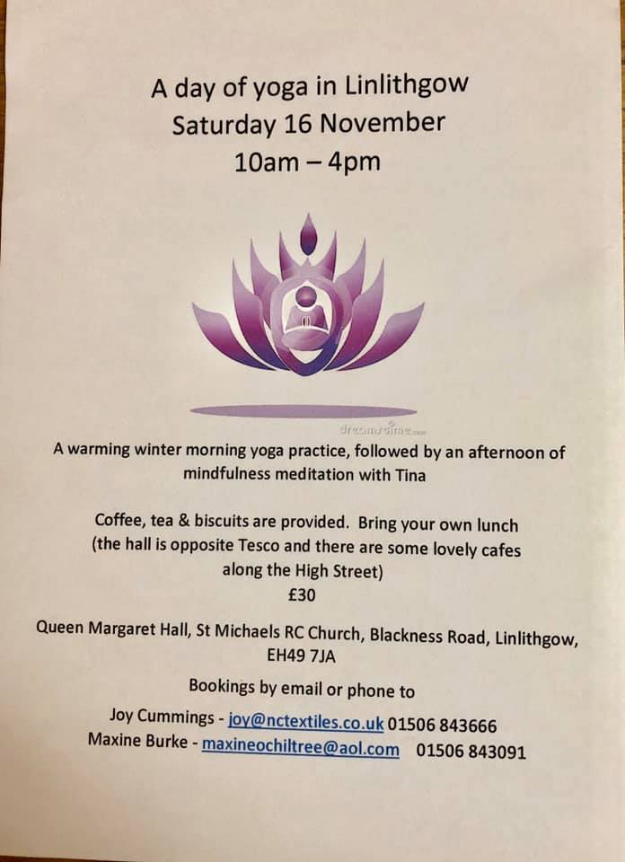 A Day Of Yoga in Linlithgow is a warming winter morning yoga practice. This practice is followed by an afternoon of mindfulness meditation with Tina. Coffee Tea and Biscuits are provided. Please bring your own lunch.