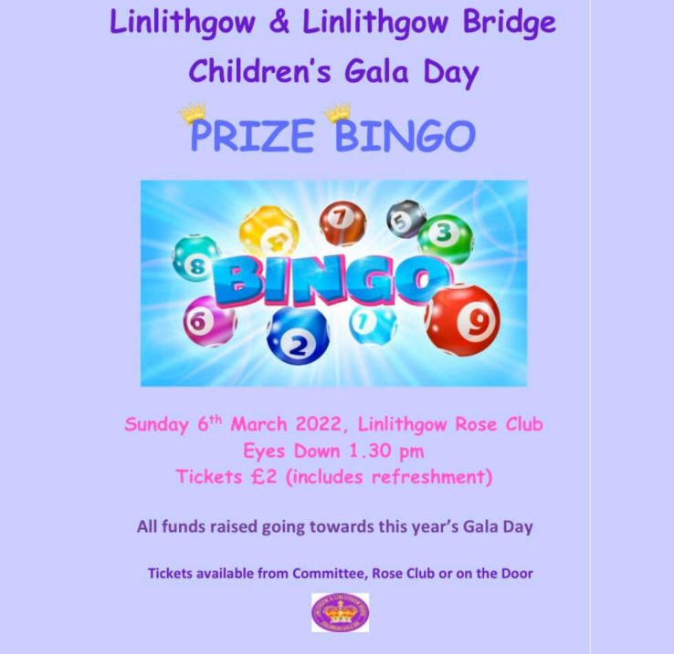 Linlithgow & Linlithgow Bridge Children’s Gala Day are holding an annual Prize Bingo on Sunday 6th March @ Linlithgow Rose Club. Eyes down at1.30pm £2 entry includes refreshments. We are looking for tombola, raffle and prizes if you have anything please message page and we will collect. Thanks again for all your support without fundraising the Gala Day would not happen!