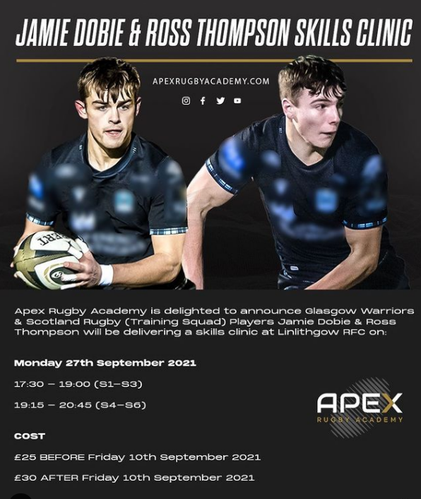 Is delighted to announce Glasgow Warriors & Scotland Rugby (Training Squad) Players Jamie Dobie & Ross Thompson will be delivering a skills clinic at Linlithgow RFC on Monday 27th September 2021