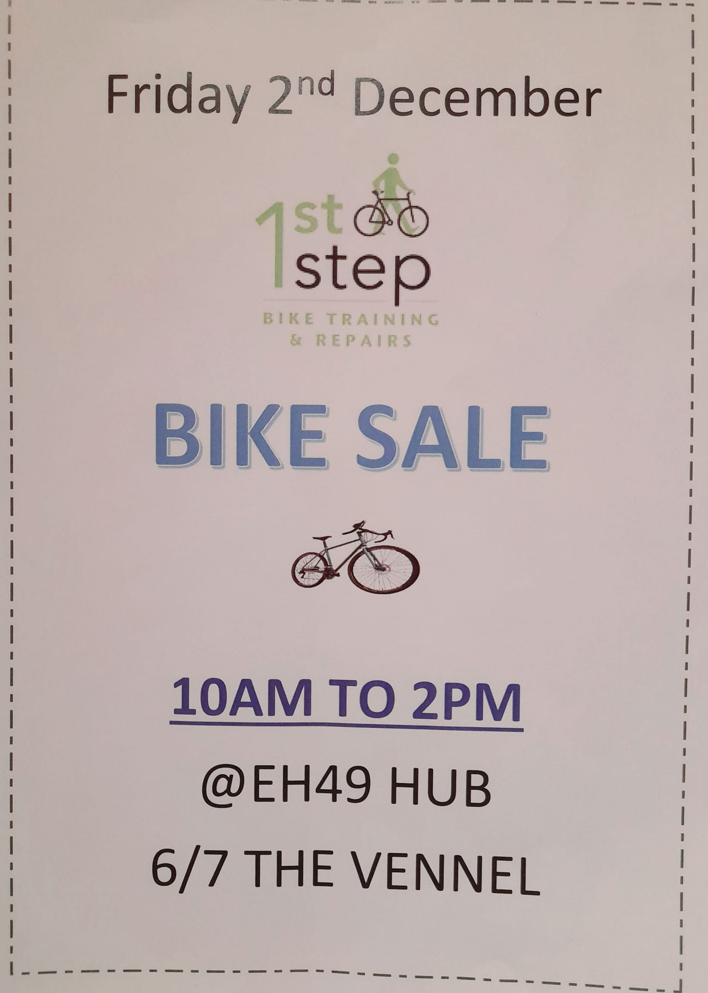 1st Step Bikes are out and about with their bike sale this Friday at the EH49 Hub, The Vennel with lots of nice, refurbished bikes for sale. Come and say hello!