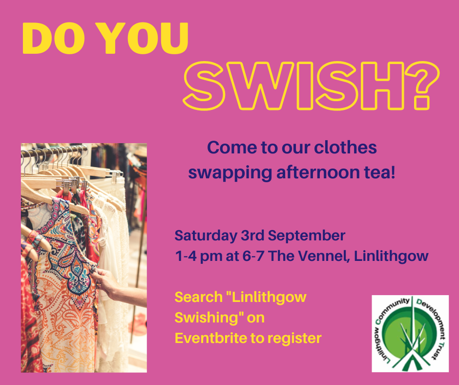 Do you maybe have some bits and pieces in your wardrobe that you just don’t wear any more, or maybe you’re looking for some inspiration or a new style? Bring them along to our swishing event where you can swap with other like minded souls. You can bring or swish as many items as you like all we ask is that they are in good condition – imagine you’re bringing something that you would lend to a friend, and that quality is definitely better than quantity! You can bring anything from clothes to shoes to accessories but sadly we cannot accept worn swimwear or underwear. You can drop your swishing items off at the Old Library, The Vennel in the week running up to the event from Monday 29th August to Thursday 1st Sept between 10 and 4. You can also drop them off on the day of the event between 10 and 12. Dropping items off early gives us time to get everything organised so you can spend your swishing time happily browsing. We are asking for a donation on the door for entry, with our suggested donation being £5. We’re also including teas/coffees and a selection of tasty cakes and treats so you’ll have a chance to sit back and relax after a busy swishing session.