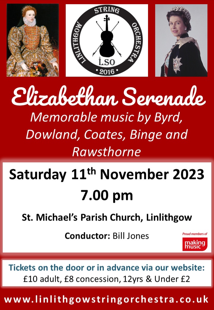 Linlithgow String Orchestra’s (LSO) forthcoming concert features music associated with two great Elizabethan periods. Byrd and Dowland (who respectively died 400 and 397 years ago) are truly great composers who lived during a turbulent period of religious division but also at the centre of artistic brilliance. We feature string arrangements of some beautiful melodies and lively dances. The programme also features beautifully-crafted music representing the British light music genre: Eric Coates’ Knightsbridge March and By A Sleepy Lagoon (aka Desert Island Discs) and Alan Rawsthorne’s Light Music For Strings. In fact the whole concert will be full of hummable tunes that you will not be able to forget… including Ronald Binge’s Elizabethan Serenade.