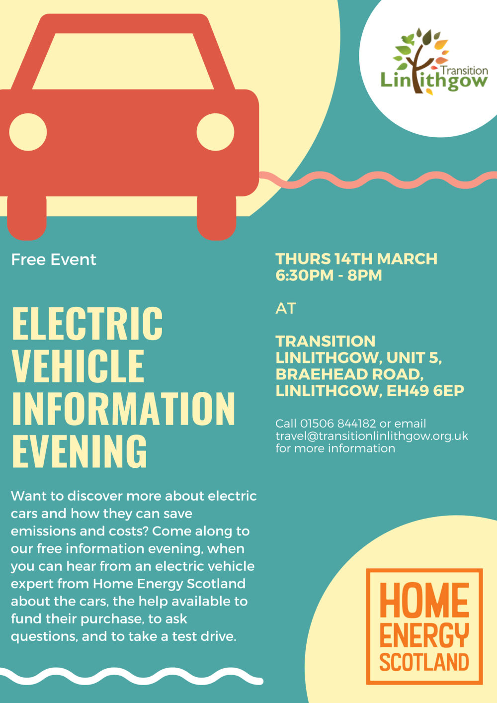 The event will be held at Transition Linlithgow’s community hub – Unit 5, Braehead Road, Linlithgow, EH49 6EP – opposite Linlithgow Rose Football Club. This event is free and everyone is welcome but registration is essential. Please book on to the event by visiting Eventbrite – https://www.eventbrite.co.uk/e/electric-vehicle-information-evening-tickets-56405446208-. If you have trouble booking please phone 01506 844182 or email [email protected] and we’ll be happy to help.