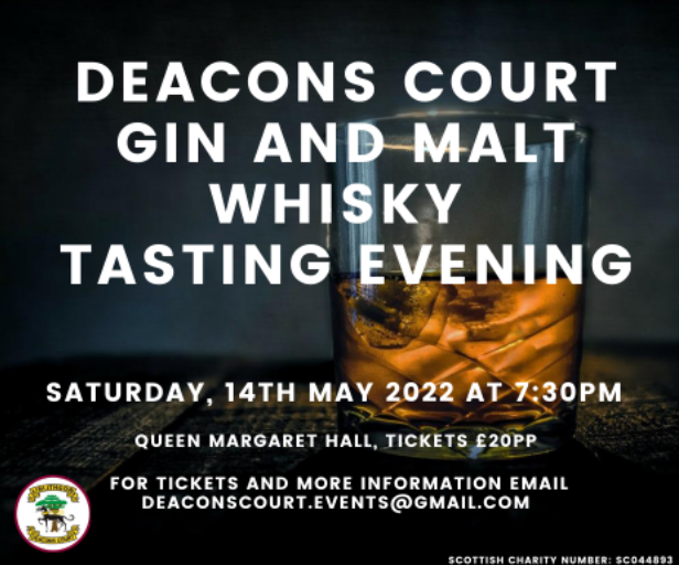 There are still tickets available for the Gin and Malt Whisky Tasting Night on Saturday 14th May in Queen Margaret Hall, Linlithgow. Tickets are £20 and are available by contacting [email protected]