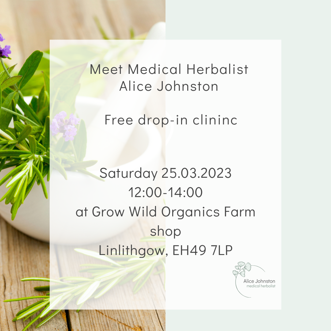 My name is Alice Johnston, consultant Medical Herbalist and I will be running a ‘Meet the herbalist – free drop in clinic’