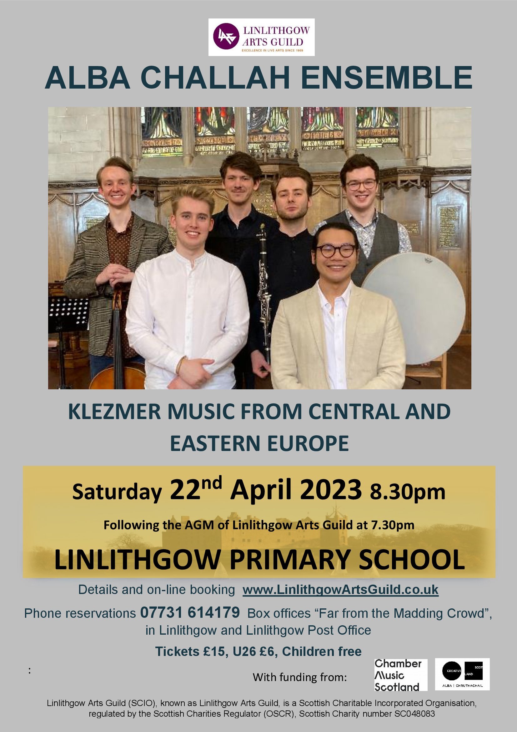 The concert at 8.30pm is open to all. It will be preceded by the AGM of Linlithgow Arts Guild at 7.30pm, with prosecco and chocolates for members and guests from 8pm.