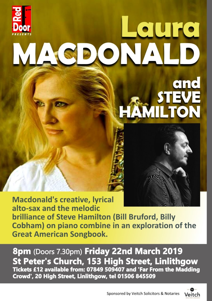 Duet between alto saxophonist Laura Macdonald and keyboardist Steve Hamilton. Laura Macdonald is one of the UK’s leading saxophonists with a musical history that includes fronting a band that included David