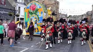 The Deacons’ Court official party breakfasts in the Burgh Halls at 8-30am. Other organisations meet in establishments around the burgh. The various groups begin to rally around the Royal Palace before taking their places in the High Street for the 11 o’clock start. On the ringing of the Burgh Hall bell, at 11 am sharp, the parade moves off towards Linlithgow Bridge. Anyone and any organisation can enter a float or tableau or decorated bike in the parade – just email the clerk for details Email [email protected]