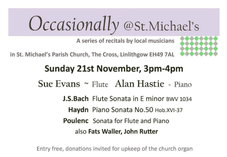 After the successful launch of the series with the Hastie duo on viola and piano, the next [email protected]’s recital shall take place at 3pm on Sunday 21st November, featuring Sue Evans on flute, with Alan Hastie on piano. Sue studied at the Royal Scottish Academy of Music and Drama (now the Royal Conservatoire of Scotland), and at the Rimsky-Korsakov St Petersburg State Conservatory in Russia. Since graduating, she has worked with all the Scottish orchestras, including RSNO, Scottish Opera, BBC SSO, Scottish Ballet, SCO, Ludus Baroque and the Dunedin Consort. She also performs as part of the Sue Evans Flute and Harp Duo, and has lectured at Edinburgh College, and St George’s School, Edinburgh. Currently she teaches Woodwind for West Lothian Council. The programme includes the celebrated Flute Sonata by Poulenc, and music from Bach and Haydn, with some Fats Waller, and an elegant Jazz Waltz by John Rutter.