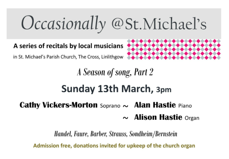 [email protected]’s: A Season of Song, part 2. Sunday 13th March, 3pm. Cathy Vickers-Morton (soprano) Alan Hastie (piano) Alison Hastie (organ). Cathy’s programme spans Italian aria, French sacred song