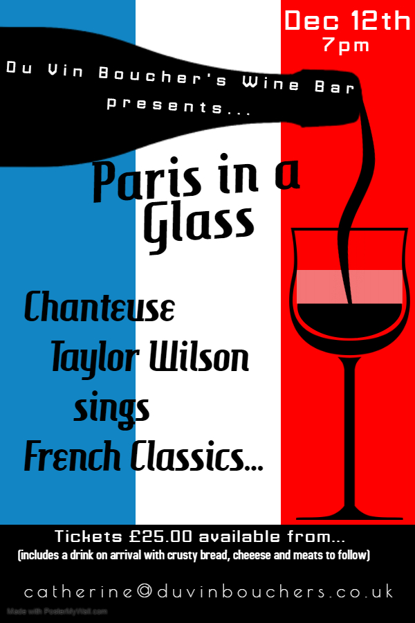 How about this festive cracker !!! Chanteuse Taylor Wilson sings French Classics. Only 20 seats available. Tickets £25 includes a drink on arrival and bread, cheese and meats, Contact: [email protected].uk