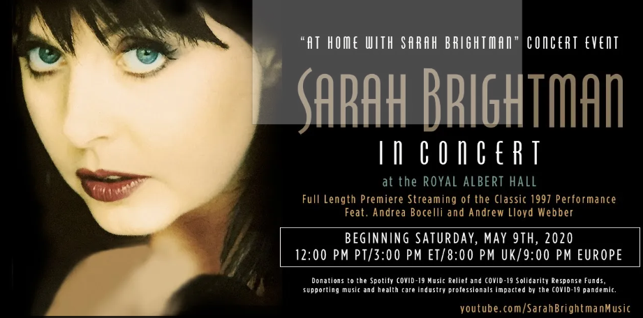 This Saturday May 9th, 2020, join Sarah for the full length streaming premiere of her historical “SARAH BRIGHTMAN: IN CONCERT AT THE ROYAL ALBERT HALL” performance beginning