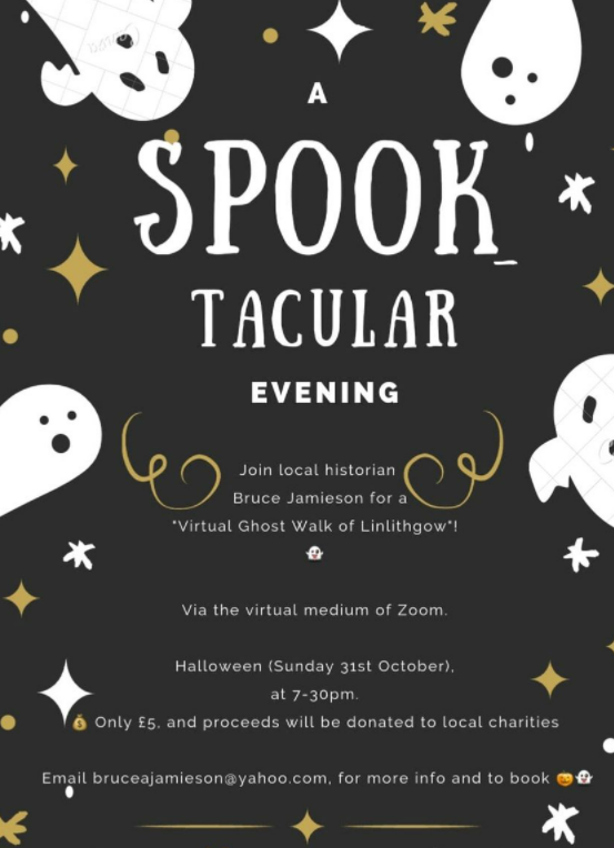 Join local historian Bruce Jamieson for a ‘Virtual Ghost Walk of Linlithgow’! Via the virtual medium of Zoom.