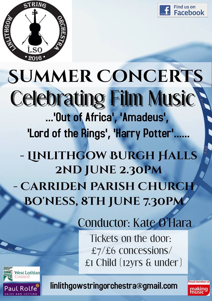 Join us for our summer concert celebrating the music of the movies. Mozart (‘Amadeus’), John Barry (‘Out of Africa’), Harry Potter…Lord of the Rings…to name but a few!