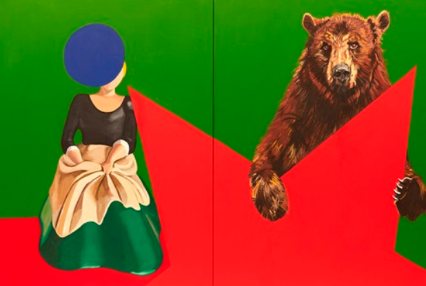 The painting method which Clare Andrews employs is completely traditional oil paint on canvas but she is really interested in contrast, in her own visual language. In her work, she uses the figurative and the abstract, large areas and shapes of flat colour interacting with realistic figurative images and apparently unrelated subject matter. Each visual metaphor therefore has an equal weight of importance in the finished painting. The resulting pictures may have some sort of narrative but usually do not. They are left open-ended for the viewer to complete.