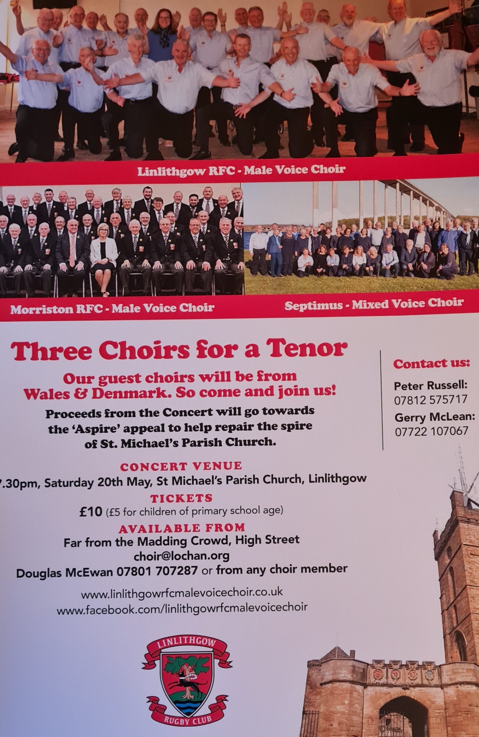 “Three Choirs for a Tenor” Concert raising funds for the Aspire Appeal Linithgow RFC Male Voice Choir are delighted to host Morriston RFC Male Voice Choir from Wales and the Septimus Choir from Denmark in a Concert raising funds for such an important local cause. Please join us for a wonderful evening of singing, with a truly International flavour. Tickets are £10, available from Far from the Madding Crowd on Linlithgow High Street or Telehone: 07801 707287.