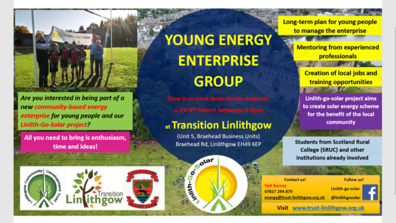 A wee gathering to chat to young people and older generations enthusiastic about renewables about our Linlith-Go-Solar plans and how you might get involved. Hope to see you there at the Transition Linlithgow Unit. See flyer for more details and let us know if you wish to attend. Drop in anytime between 6-8pm. Contact: Neil [email protected] 1st February 6-8pm at the Rugby Club.